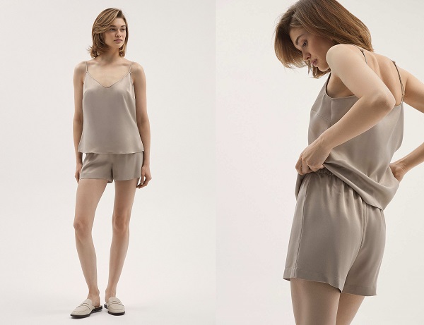 Вискозные топы создают ощущение невесомости. Их гладкая поверхность контрастирует с фактурой шорт, добавляет образу глубины. Такие модели подчеркивают домашнюю природу модного лука в бельевом стиле.